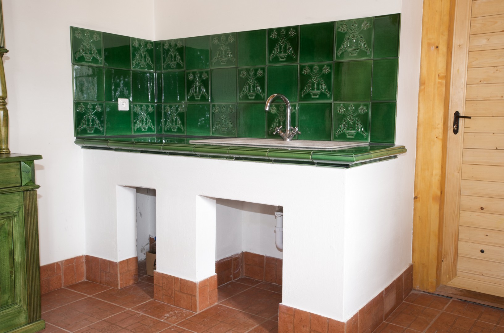 Ezen miliő megőrzése érdekében ugyanazon helységben kiegészítés képpen található a mosogató, amely gyönyörű ötvözete a múltnak és jelennek. A tradicionális magyar mintákat megtalálhatjuk a falon, mely elvonja a figyelmet a modern világ vívmányairól (pl: felváltotta a vezetékes víz a kutat) mégis tökéletes összhangot teremtve. A ház és a kemence építője a fal anyagától a búboskemencén és a bútorzaton keresztül, a legapróbb részletekig odafigyelt, hogy a vidéki múltat idézze.